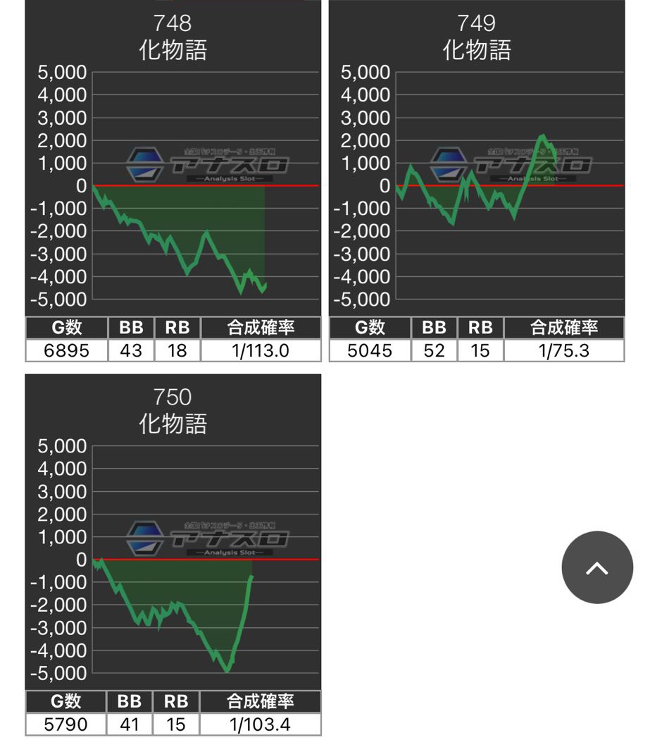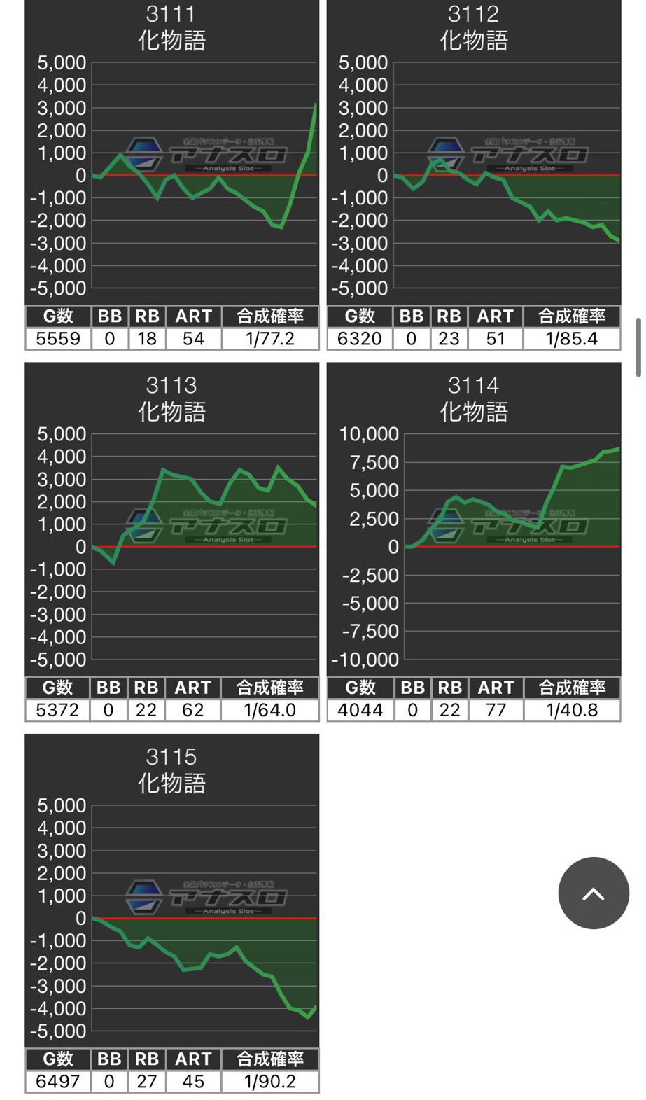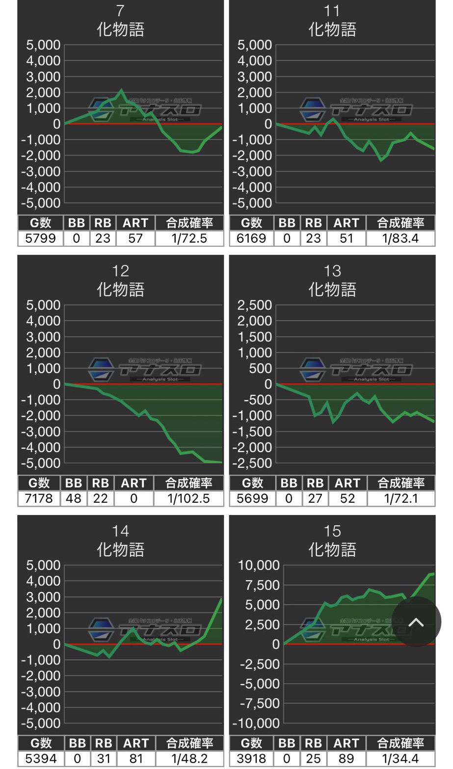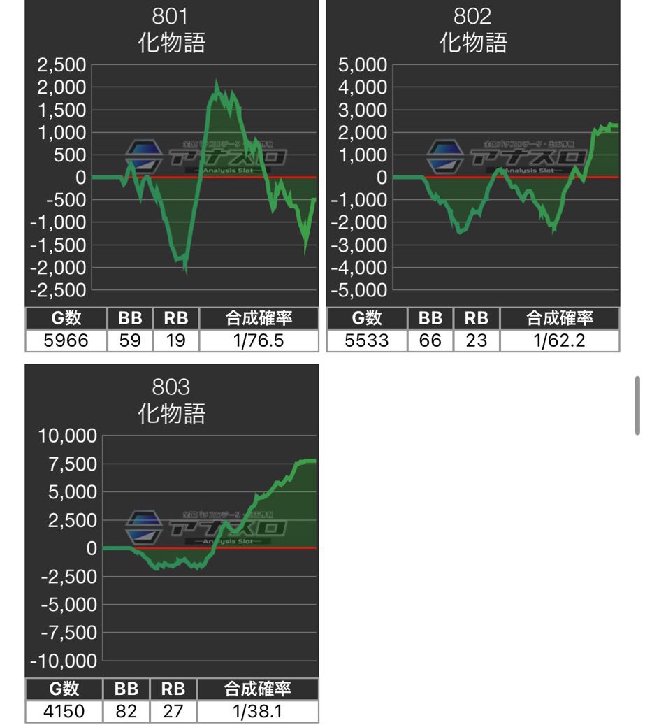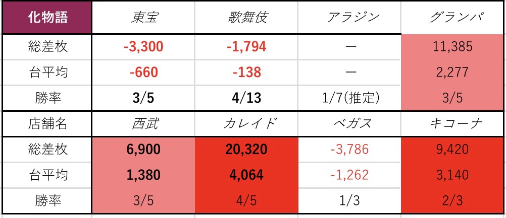 今回の化物語の新台初日結果ですが、これまでの結果とは少々異なり、好成績を納めた店舗がいくつか出てきました。特にキコーナ、カレイド、この2店舗の結果が全台系だったため、今後の扱いや次回の新台の際にも期待できるといえるでしょう。また、グランパは特日と重なったからか配分もよく、西武は安定した結果を残し続けています。