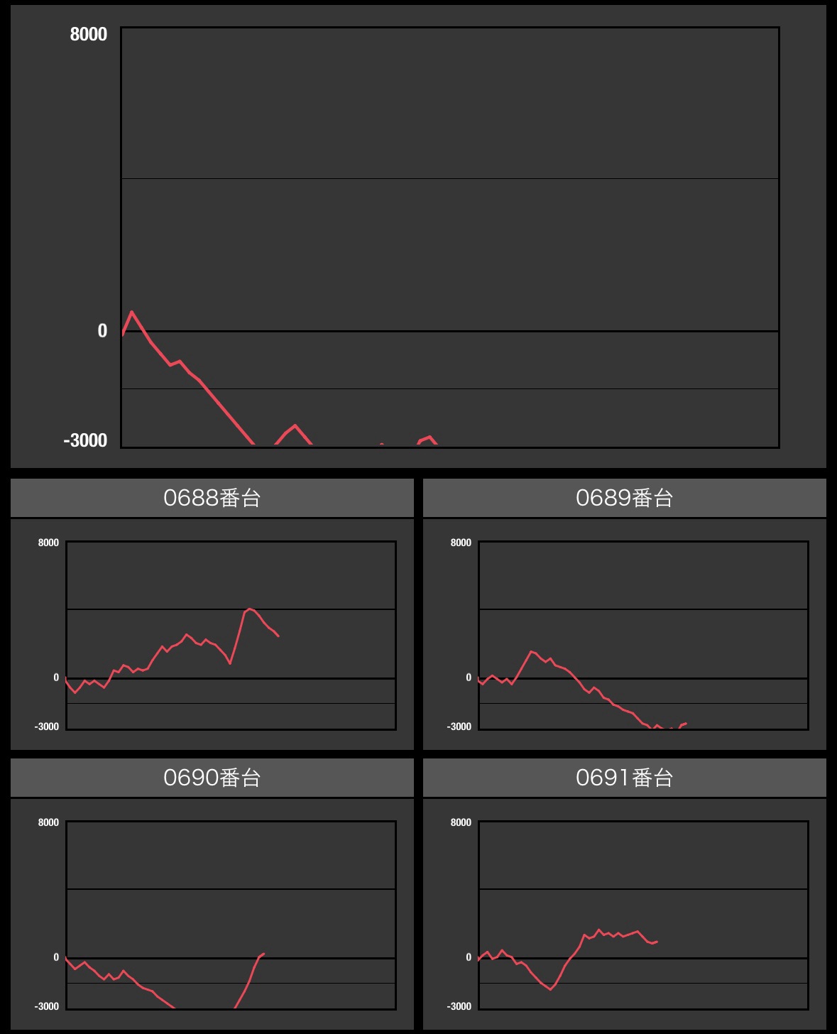 688は入っていそうなグラフとデータです。東宝の初日はほとんどの場合で回収運用傾向ですが、今回もそれが崩れることはありませんでした。全台系に選択されるのも大体2〜3週間ほど経ってからなので、それまでは全台系狙いでは座らない選択がプラスになると個人的には思います。