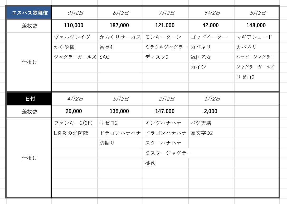 この記事ではタイトル通り、エスパス新宿歌舞伎町店の過去データと傾向をまとめた記事となっています。