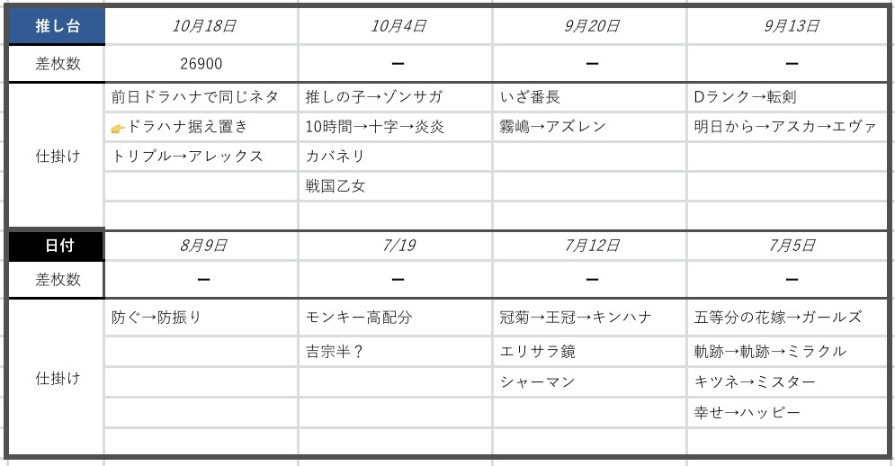 この記事ではタイトル通り、エスパス新宿歌舞伎町店の推し台は推せる時に押せ!(以降推し台)の過去データと傾向をまとめた記事となっています。