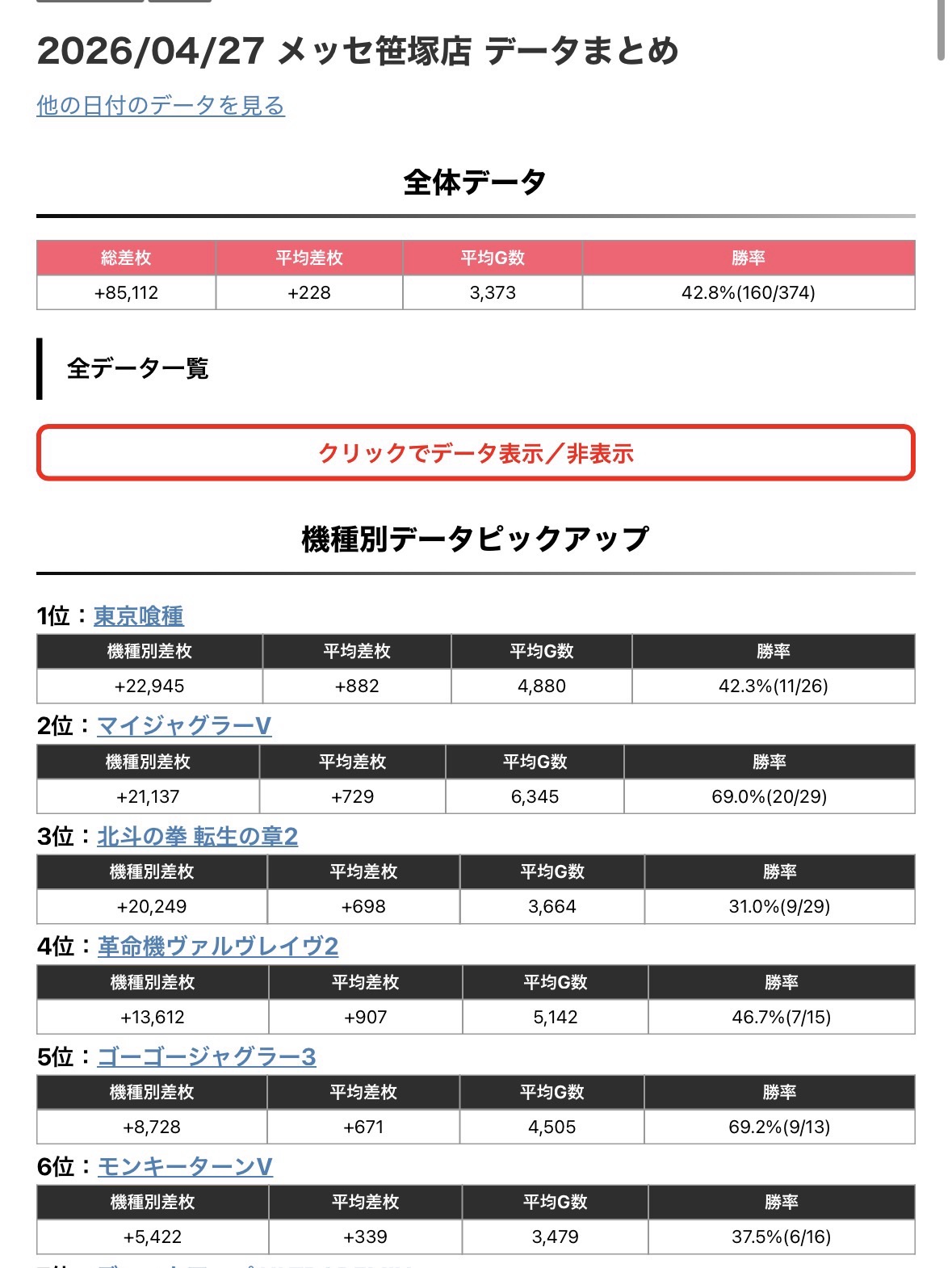 ただ、晒し屋がまとめていた前回の結果が7/2で笑ったのと、店長ポストの一文にある【過去一】って、ほぼ全日でマイナスなんだから当たり前だろと思ったのは黙っておきましょう。(客側プラスなのは2日のみでプラスもギリプラス)
