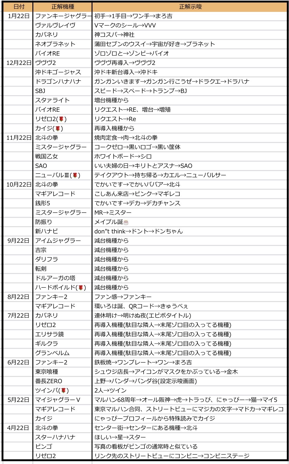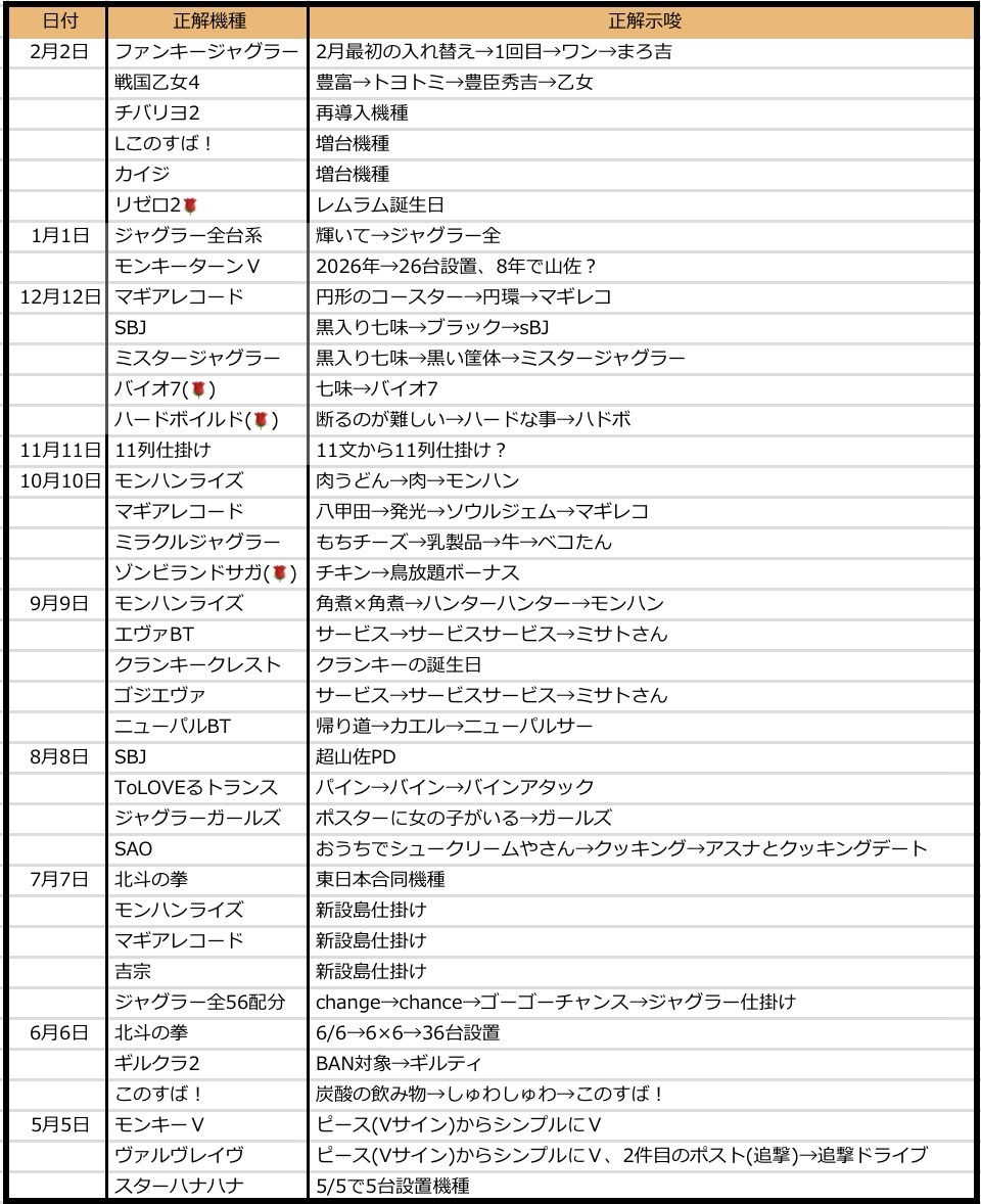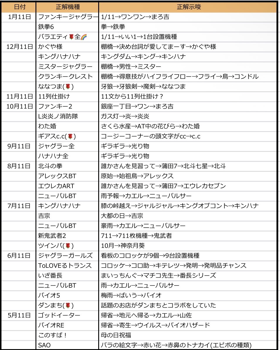 - 月日ゾロ目はその月の数字にまつわる仕掛けを多く選択しており、5/5のモンキー、7/7の北斗、11/11の11列仕掛け、2/2の2まつわりなどが挙げられるため、毎月の数字まつわるには注目する
