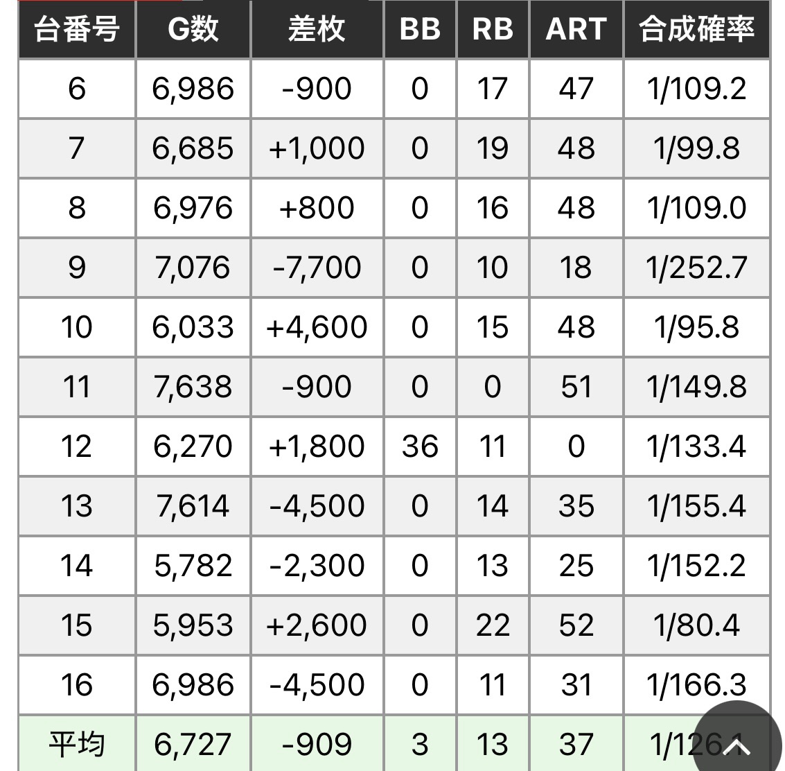 1台だけ突き抜けています。他の台はかなり気合の入った人が回していたのか、交代交代で回されたのかは不明ですがかなり凹んでいます。突き抜けた台がある中でこのマイナスなので相当厳しかったと思います。