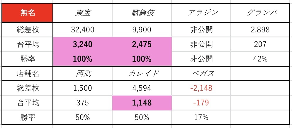 - 各データについて、マルハンはマルハンアプリ、アラジンはジャグラーオンラインアプリ、そのほかはアナスロを使用しています。