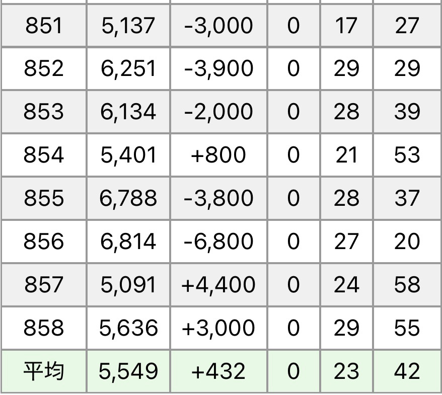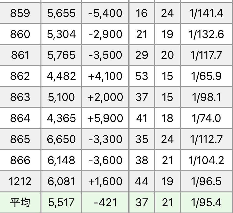 データ半分非公開みたいな感じなのでわかりづらいですが、平均最大枚数(下から出た枚数)で5000枚超えは最低でも1/2はあったのかなと推測します。ただ、晒し屋からの発表がないのと、私自身も当日の発表を見逃したので、ヒキの可能性もあります。