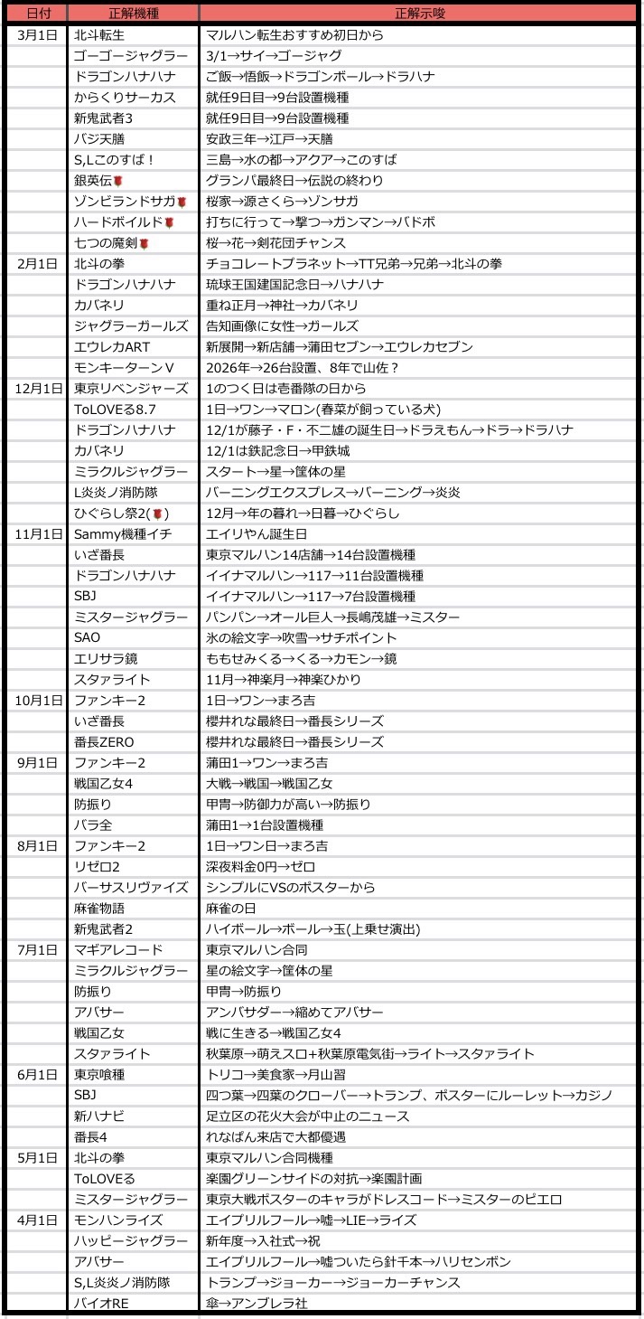 - ファンキージャグラー3連続、ドラゴンハナハナ3連続、カバネリ2連続と、月で連続仕掛けを多用する珍しい日付のひとつとなっている