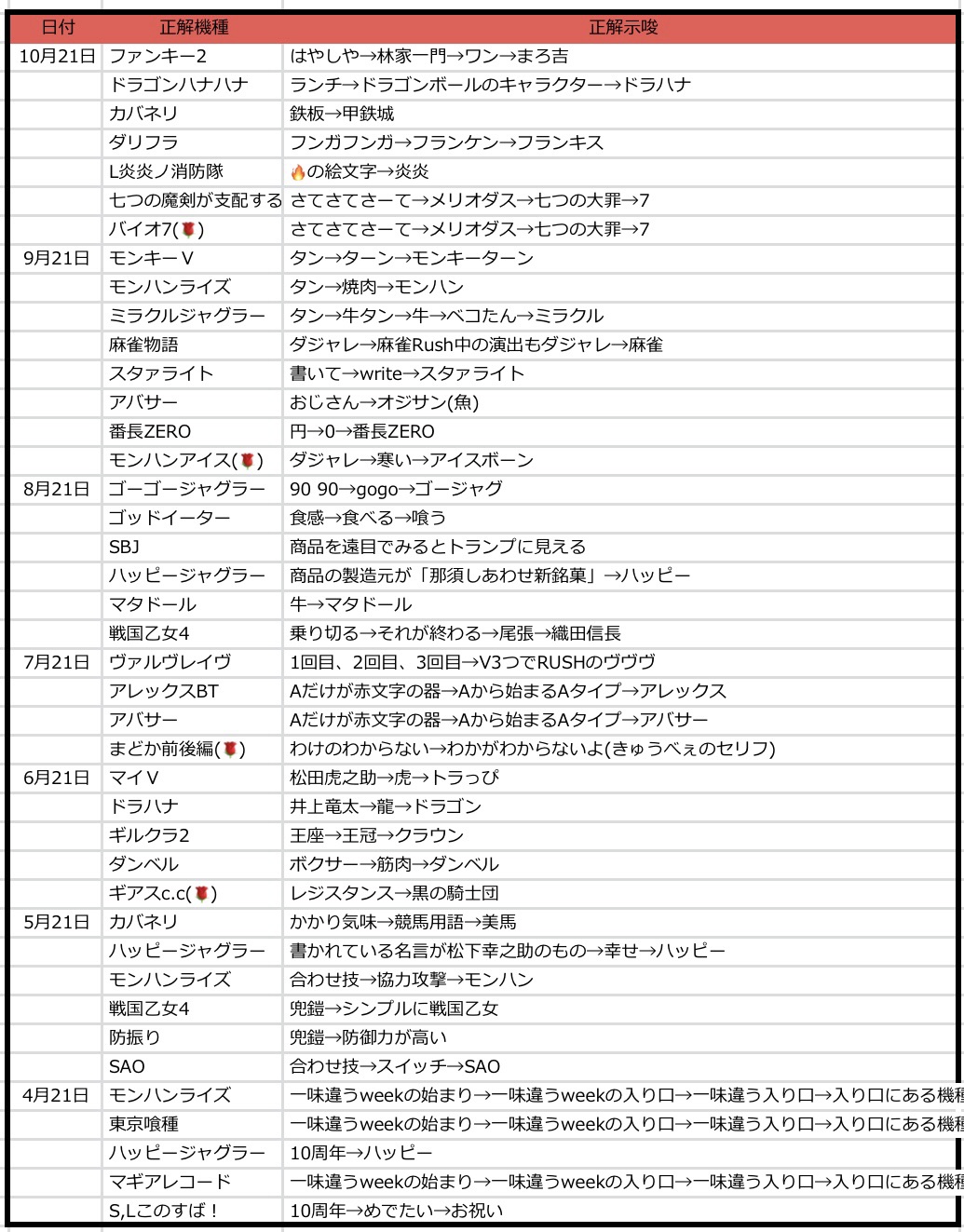 いわゆる多台数メイン機種がほとんど絡んでいる日です。やったから可能性がない、やっていないからやるという単純な仕掛けが少ないので何ともいえませんが、現時点で仕掛けがない多台数機種は、からくり、喰種、モンキー、ネオアイム、新鬼3、かぐや様です。この中では喰種、モンキー、新鬼3、かぐやあたりは毎月の傾向からも21に仕掛けがありそうではあります。
