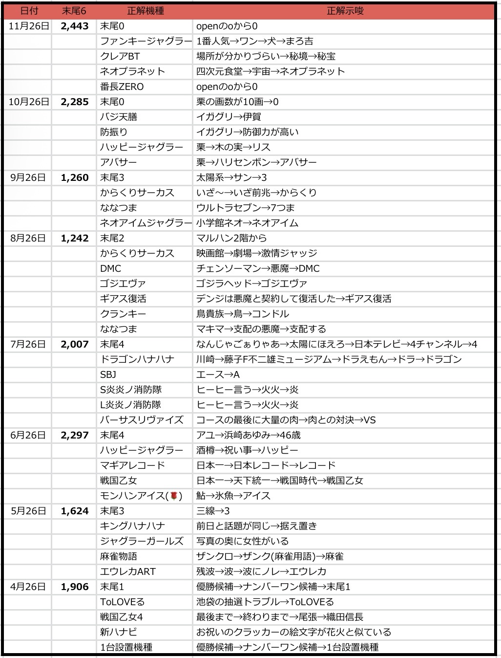 末尾が取れない方の狙いは必然的に全台系か末尾X狙いになりますが、過去結果からみても全台系は安定していませんし、末尾Xはそこまで狙えるほどではなく、競争率も意外と高いので番号次第ではスルーも推奨の日です。
