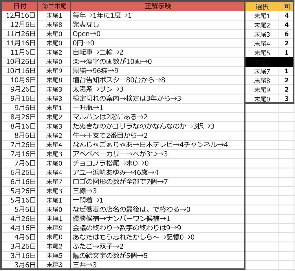 ラリーゴ就任2年目のアナザー末尾Xの過去結果一覧です。末尾3の選択が6回で最多、末尾5,7が1回ずつで並んでいます。そろそろ5か7の選択もありそうですが、最近は全く絞らせない雰囲気を感じるので示唆があれば狙う程度でしょうか。現在は3/16に行われた末尾5が1番間隔としては空いていて、次点で6/16の末尾7が空いています。
