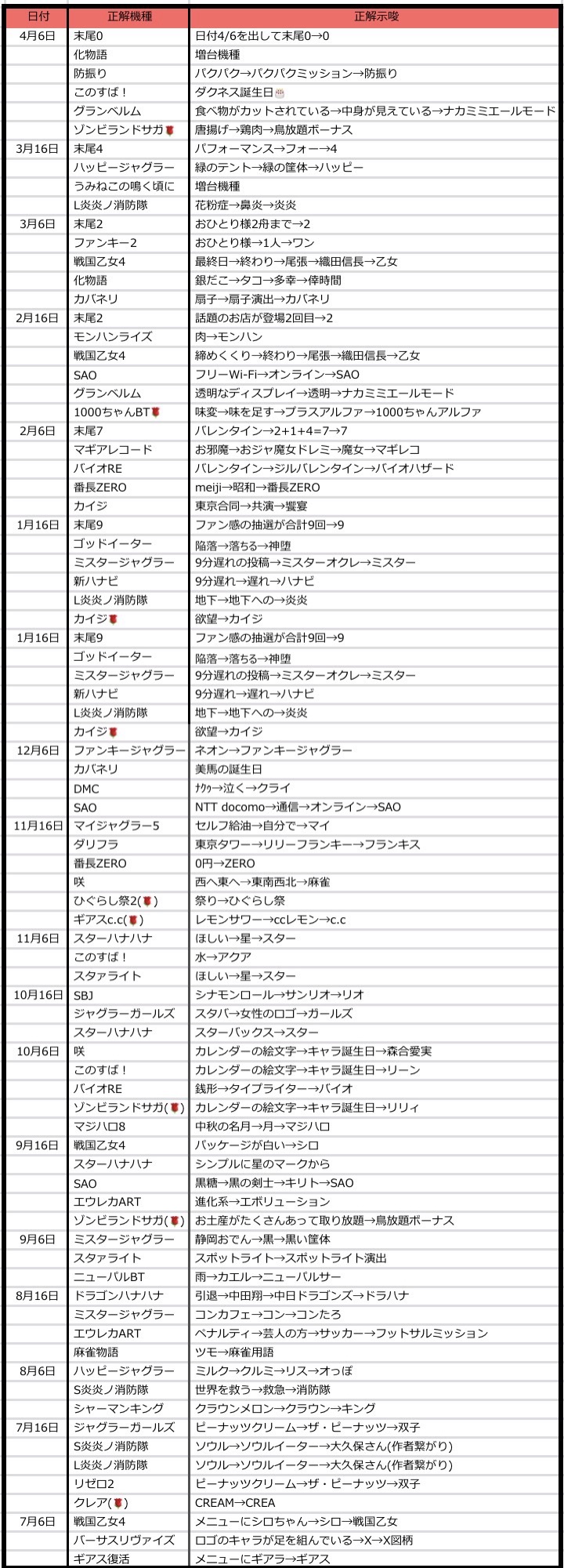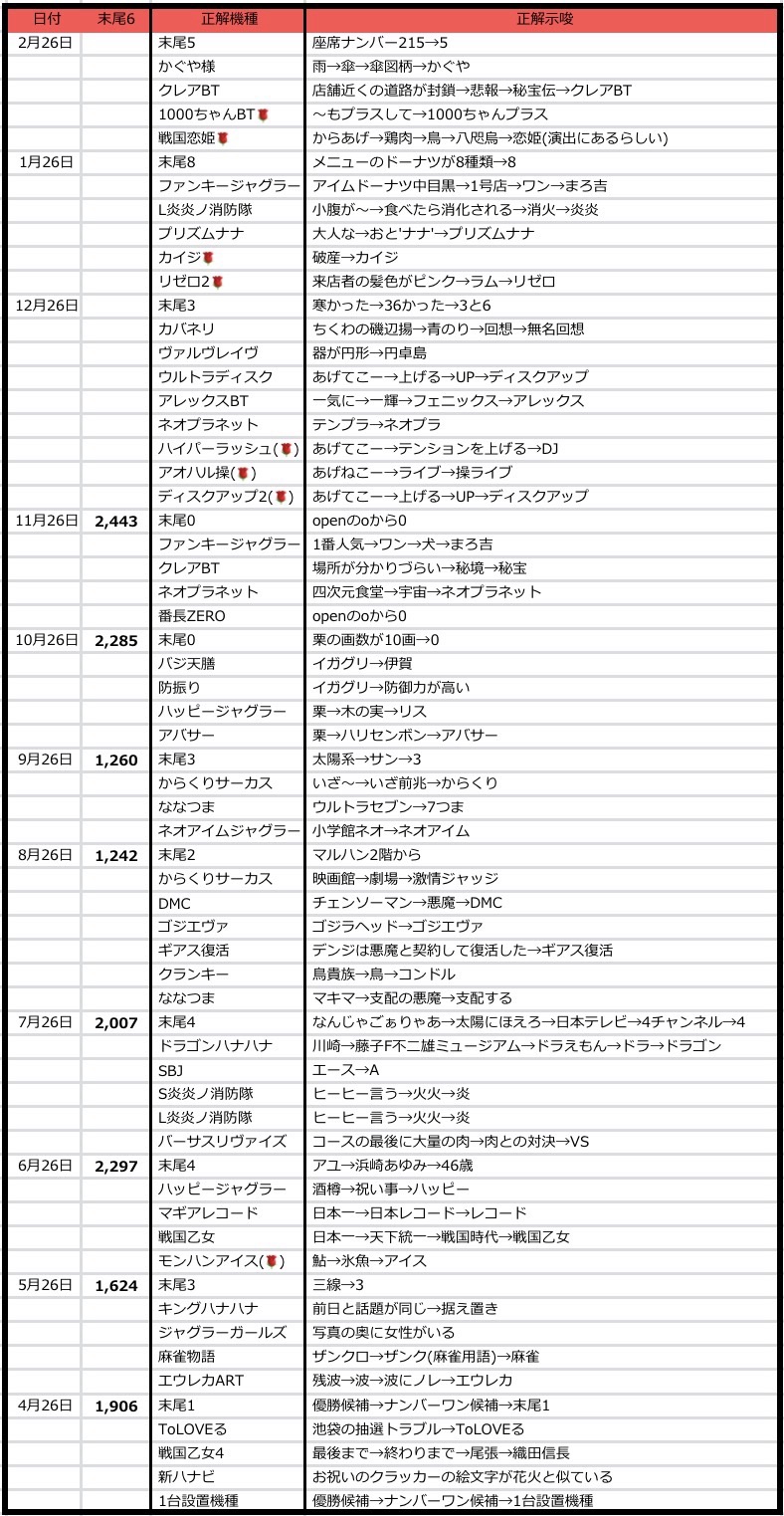 6のつく日は末尾6が鉄板級の日で、6,16,26日共にここが最優先となります。それに加えて、ジャグラーのみに適用されるアナザー末尾Xや、ラリーゴポストからの全台系狙いも狙える日となっています。