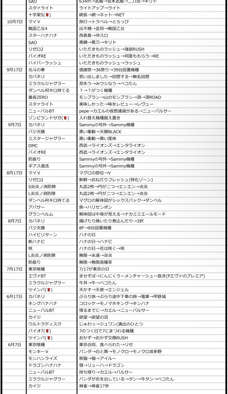 - 直近はジャグラーの選択率が100%だが、マイジャグラーの選択率がない。マイ×27日は過去に3回仕掛けがあるが、その全てが7機種仕掛け以前なので、積極的には行けない。