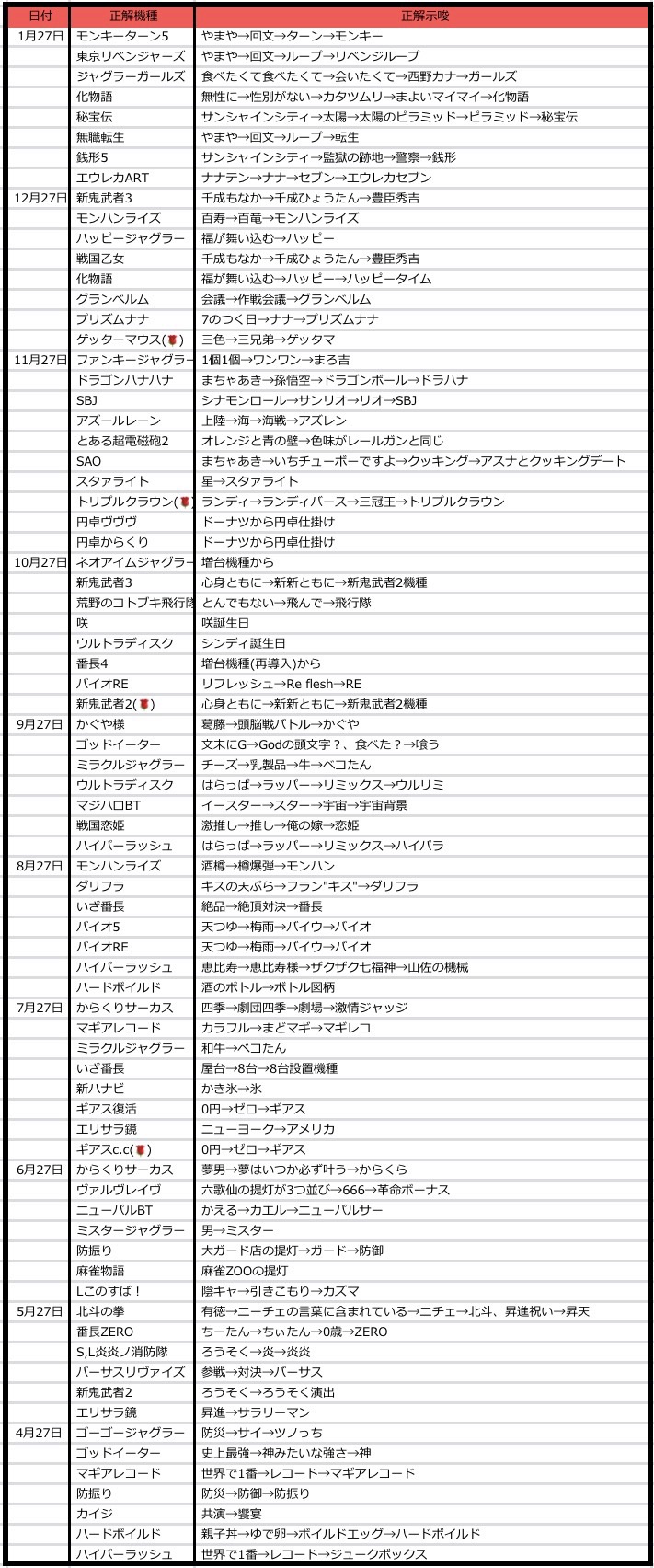 27日は7のつく日でありながら21〜27week最終日ということで、多台数仕掛けが必ず絡む日となっています。基本的には普段の7のつく日と変わりありませんが、21日から仕掛けのなかった多台数や中規模以下の全台系が選択されやすい傾向にあるため、21日からの仕掛けに目を通しておいた方がいいといえます。(時々裏をかいてくるが基本的には信用)